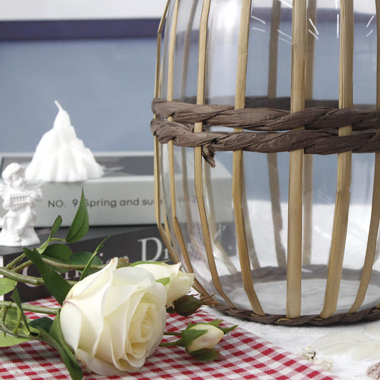 2024Wholesale customization Mouth Clear Glass With Rattan Weave Vase For Home Decor